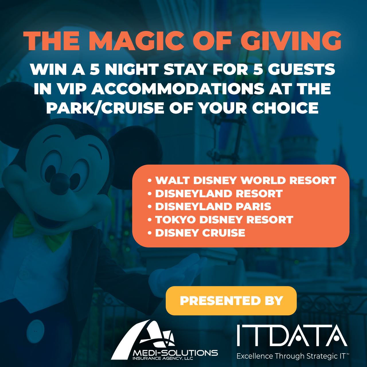Tix For Good is offering one winner the opportunity to experience Disney in extraordinary fashion. The winner will receive a five night stay at their choice of the following Disney destinations, with VIP accommodations for up to five guests: